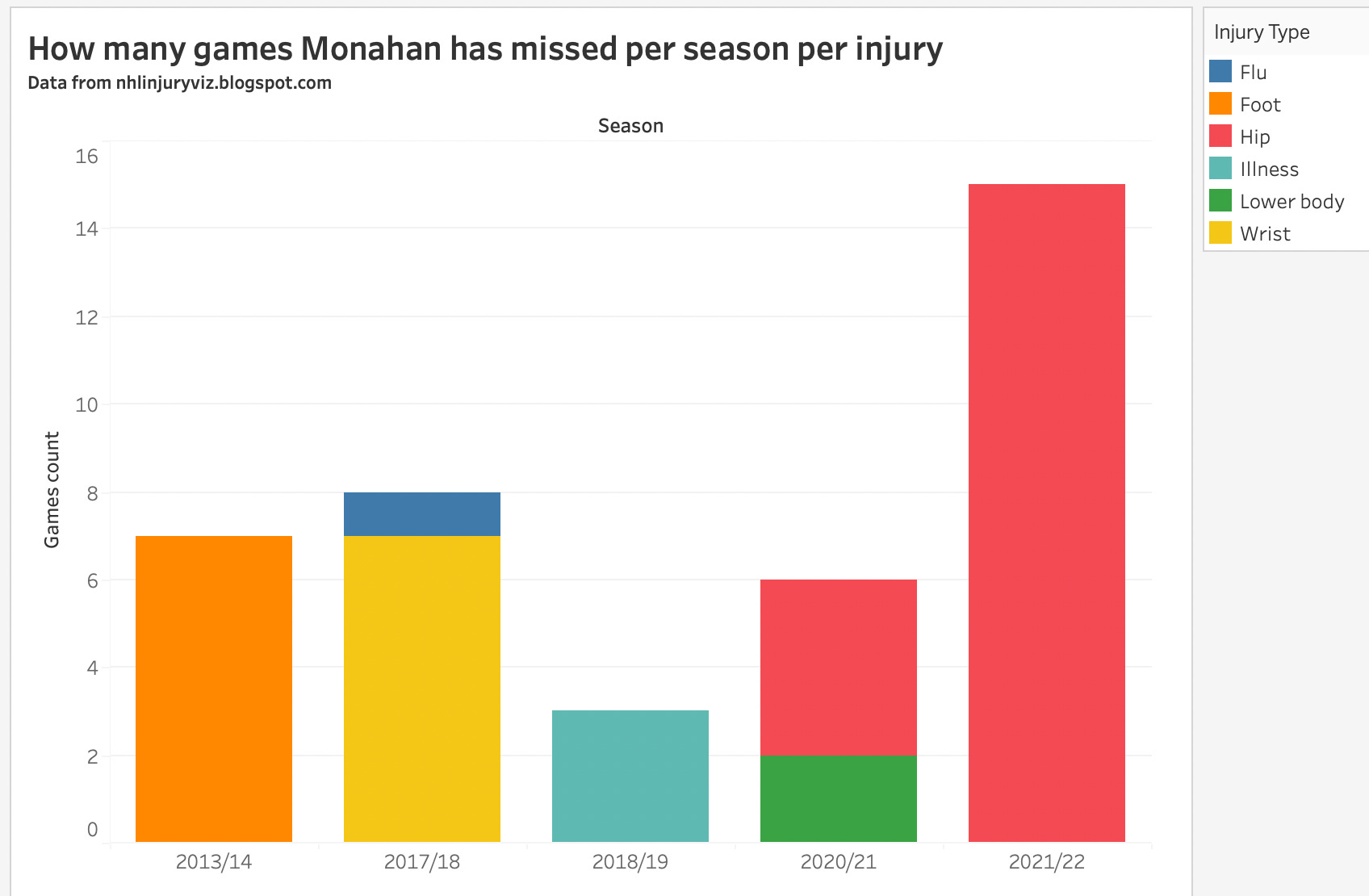 We can find out here that he still had the trust of his coaches at EV in 2020 and 2021, but he completely lost that trust last season. Since the Flames have acquired Elias Lindholm from the Hurricanes, they gave him the task to center the first line… which he did successfully. Monahan was then pushed to the 2nd line… until Mikael Backlund showed he was better than Monahan. Then, the Flames offer a big contract to Blake Coleman who was a big part of Tampa Bay’s 2021’s run to the Stanley Cup. Suddenly, Sean Monahan is a 4th line centre and for the 2nd time in his career, he gets healthy scratched. Monahan’s downfall is is peppered with multiple injuries that had an impact on his game.