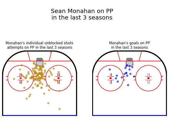 On JFresh’s player card, there is a lots of red, but one of the rare blue spots are under the “PP” text, so I assume a big part of his WAR value comes from the fact that he is good on power-play. Don’t count on Monahan to be a big puck mover and create plays at 5v5 or on PP. He is a player who will make himself available on the ice to make a good shot when the puck gets on this stick. On the power-play, he plays in the middle for the 2 faceoff dots, just in front of the goalie. That’s where he scored most of his PP goals last season. Having Monahan on Power-Play means that the Canadiens won’t need to rely as much on player who are bad on power-play and play Monahan’s role on PP (like Josh Anderson and Brendan Gallagher).
