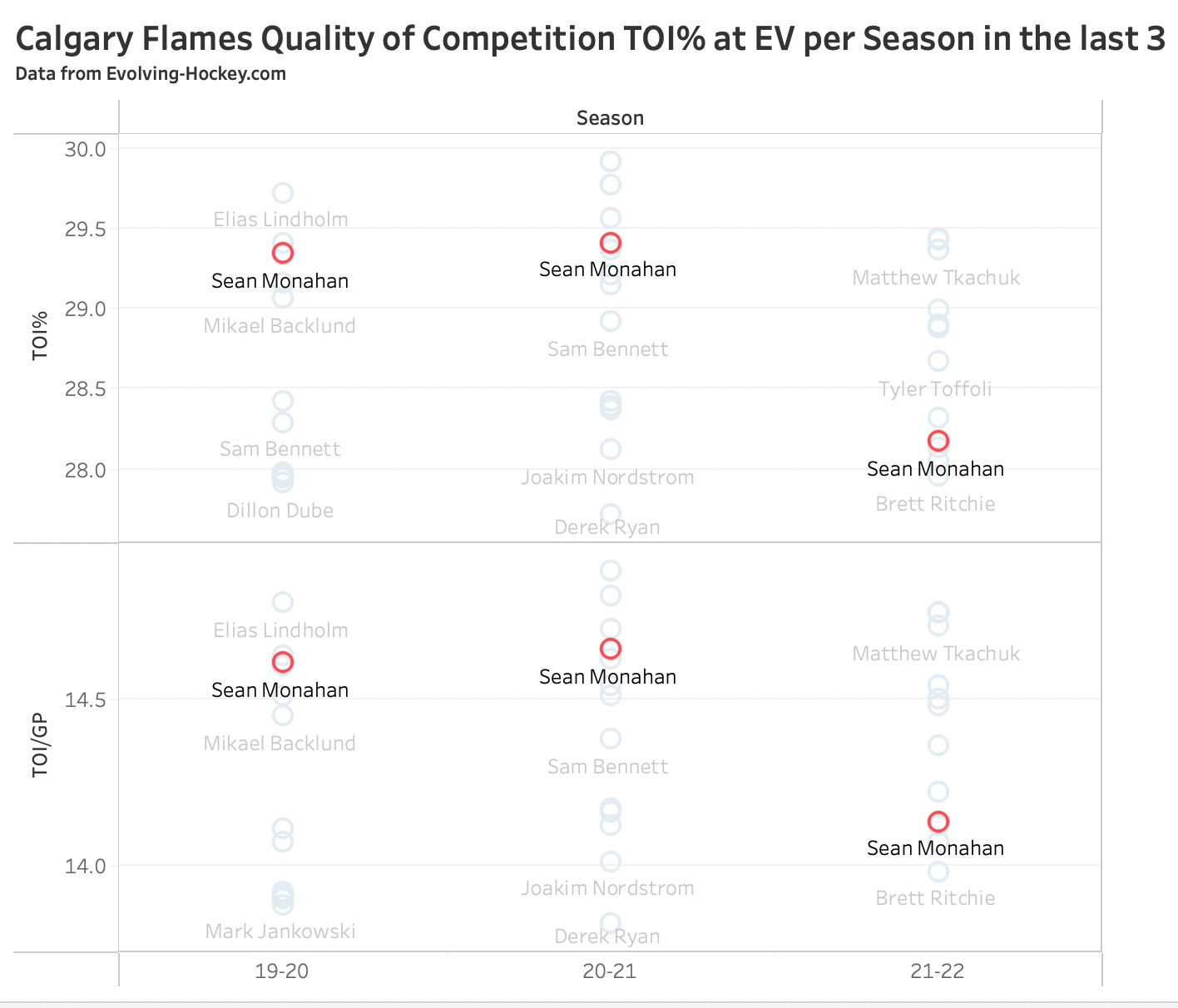 If you Google his name, you will find out Sean Monahan is a hockey player with a pretty successful career so far. He scored over 20 goals in each of his first seven seasons, and even hit the 60-point mark several times. His HockeyDB page looks really good for a player who needed a sweetener to be moved. Without further ado, let’s take a deep dive in what the numbers say about Monahan and how can we get the best out of him.