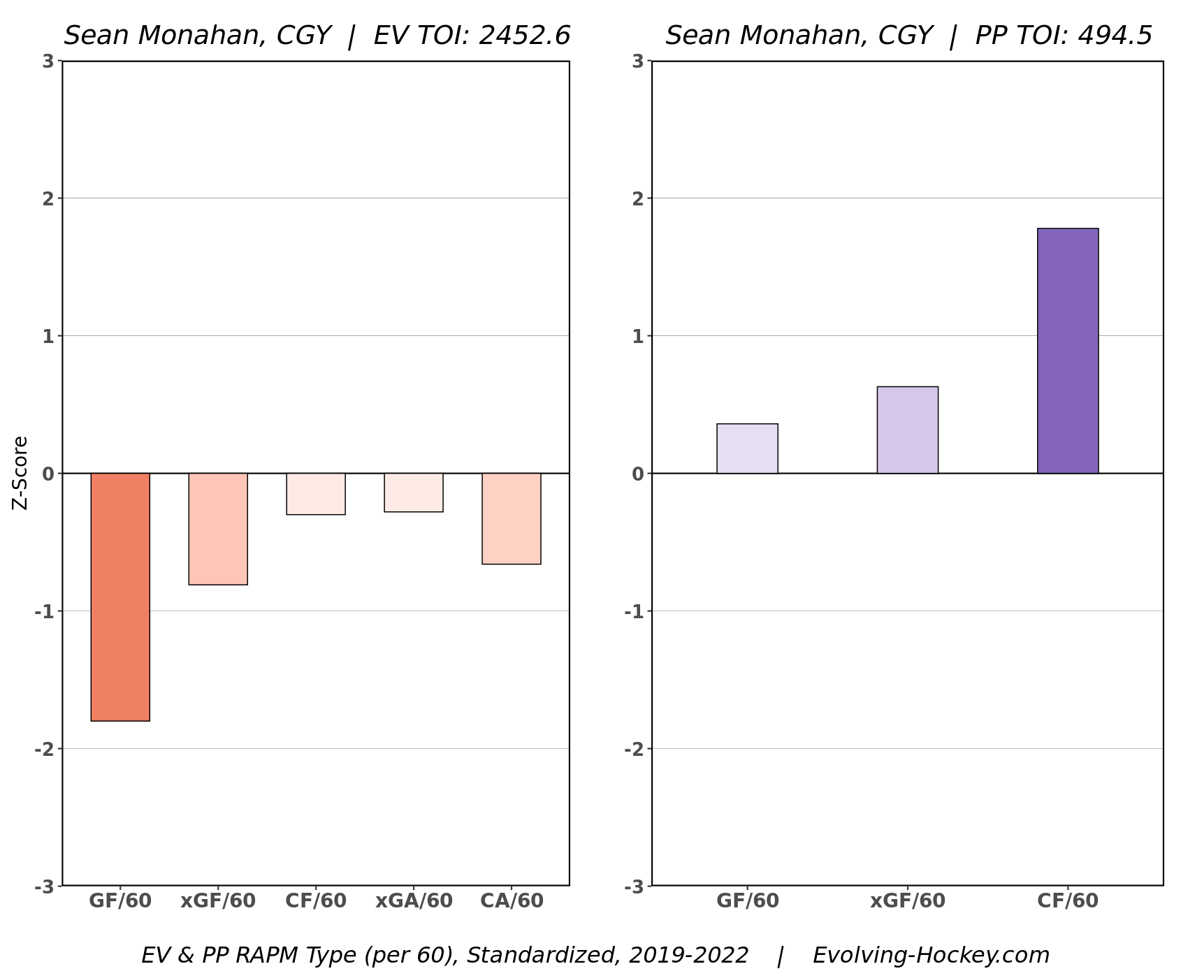 All the players are subject to potential improvement over the summer, but as of today, MTL’s #91 is not one of the best 4 C’s of the team according to my player evaluation. I notice that in the past three seasons, Monahan ranks 5th among the above-mentioned five players in Evolving-Hockey's WAR model. He ranks 5th in WAR per hour as well (and he is the only one of the 5 players with a negative impact). I also use Evolving-Hockey’s RAPM charts where we see that he is a below the average player with good PP impacts. Also, he doesn’t look dynamic at all in his skating strides (probably due to injuries) and we can get the impression that he is just lazy.