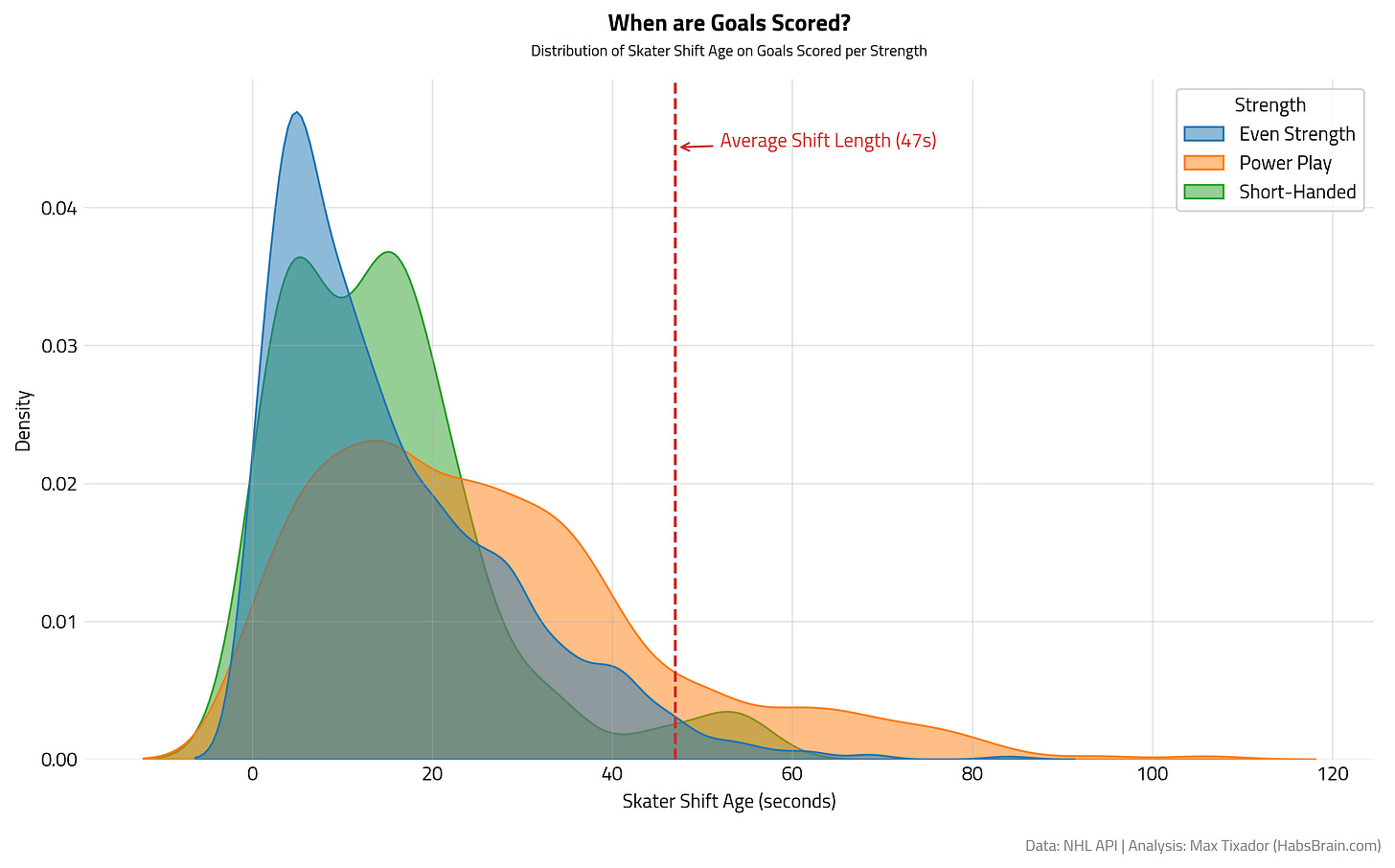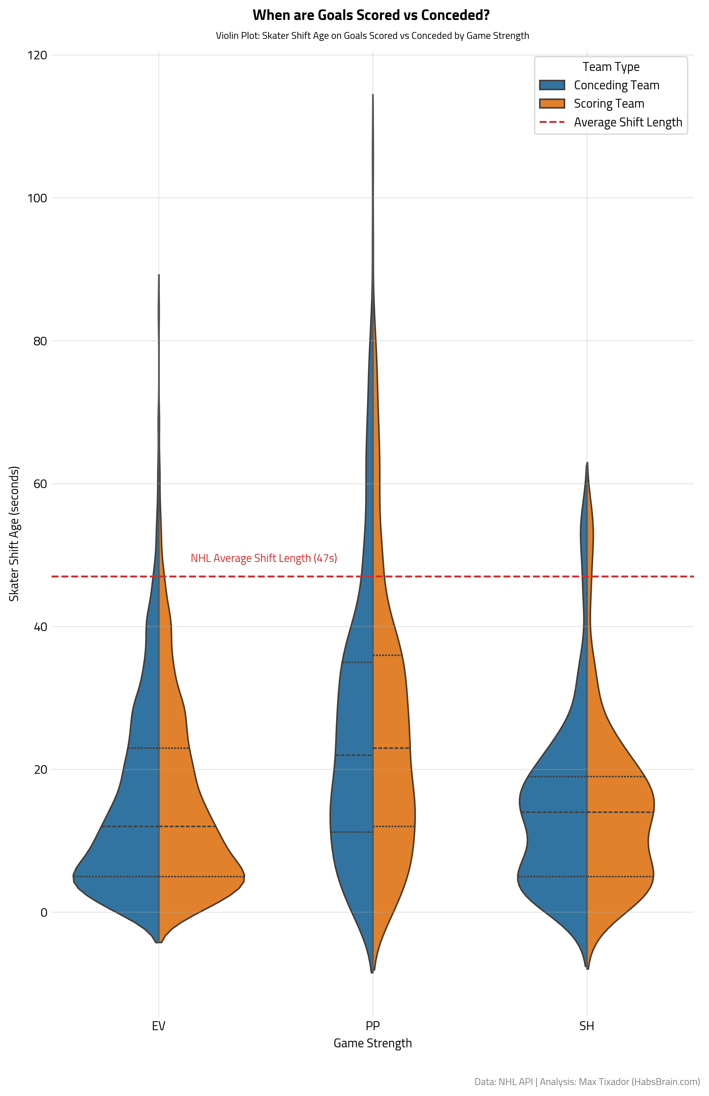 This comparative violin plot summarizes all the findings we made earlier and gives us an even more comprehensive perspective on the relationship between Goals Scored/Conceded, Shift Age, and Game Strength. Again, it is striking how, when goals do occur, they tend not to occur at extreme shift ages. Did you notice too how the lengths of the violins are different? The EV violin stops around 90s, PP near 120s, and SH closer to 60s. This teaches us something compelling about hockey: the point within a shift at which goals happen varies depending on game context. When goals are scored, Power Play shifts tend to be much older, Short-handed shifts are very young, and Even-Strength shifts fall somewhere in the middle.