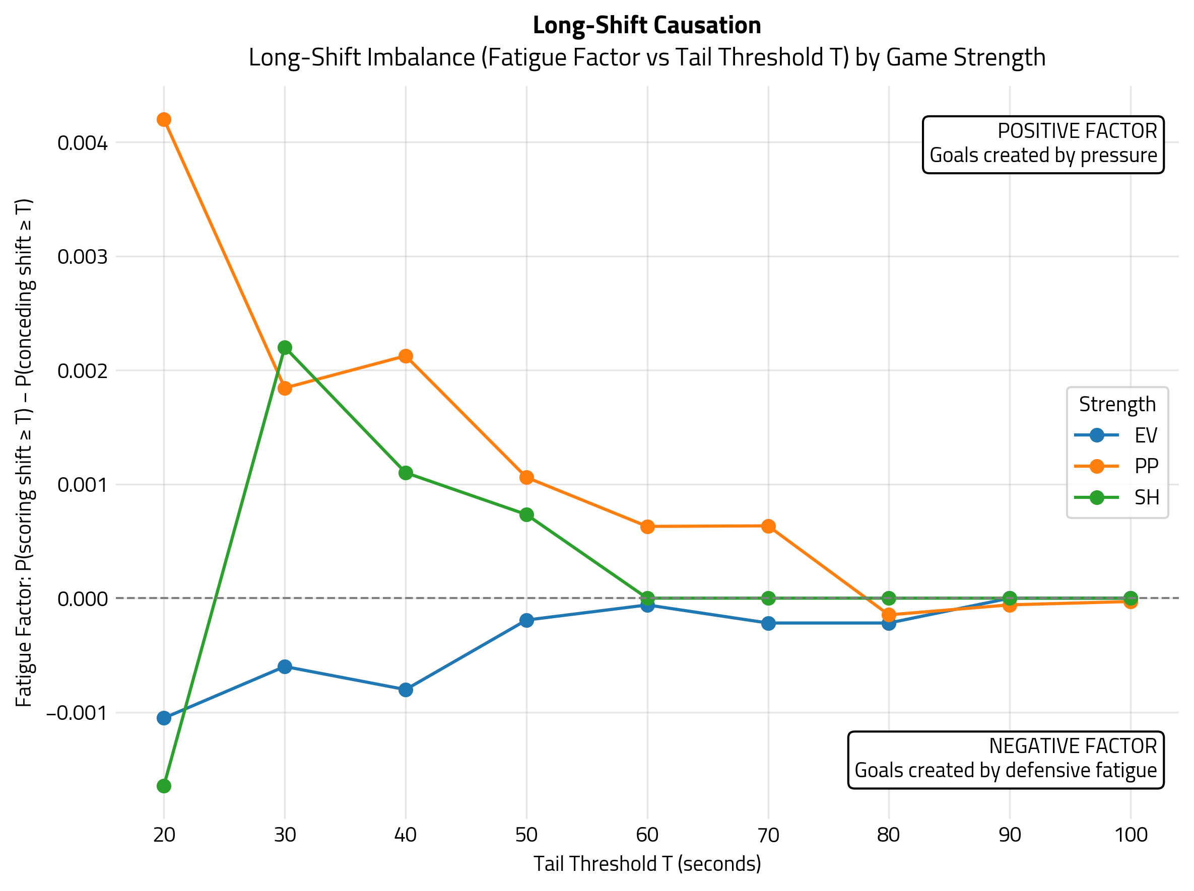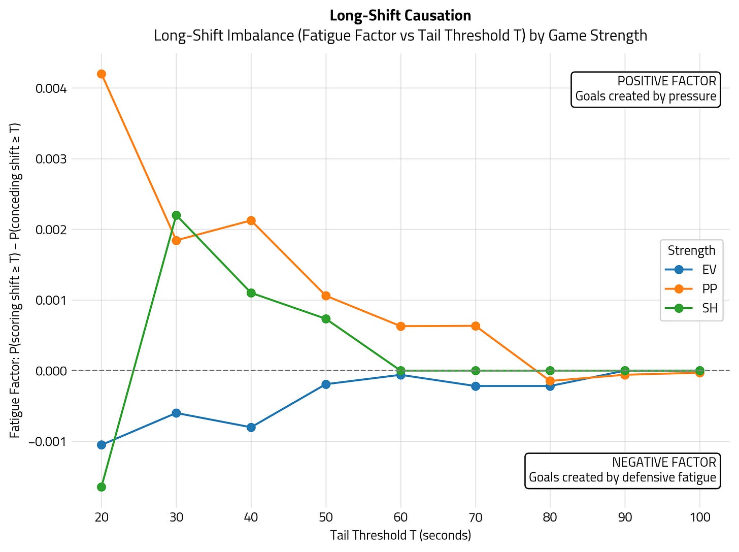 Here, the EV line close to 0 tells us that at even strength, most goals are scored when both teams have a very similar shift age. EV goals often come from transitions, broken plays, rushes, puck luck, or turnovers, so it wouldn’t be accurate to attribute them to fatigue or sustained pressure. On the Power Play, the pattern is much clearer: PP goals are driven by offensive pressure. As shifts get longer, the pressure effect naturally shrinks because long shifts are rare, but it never reverses into defensive fatigue. Short-handed results are noisy, which makes sense: SH shifts are short and SH goals are rare. SH data are volatile due to small samples.