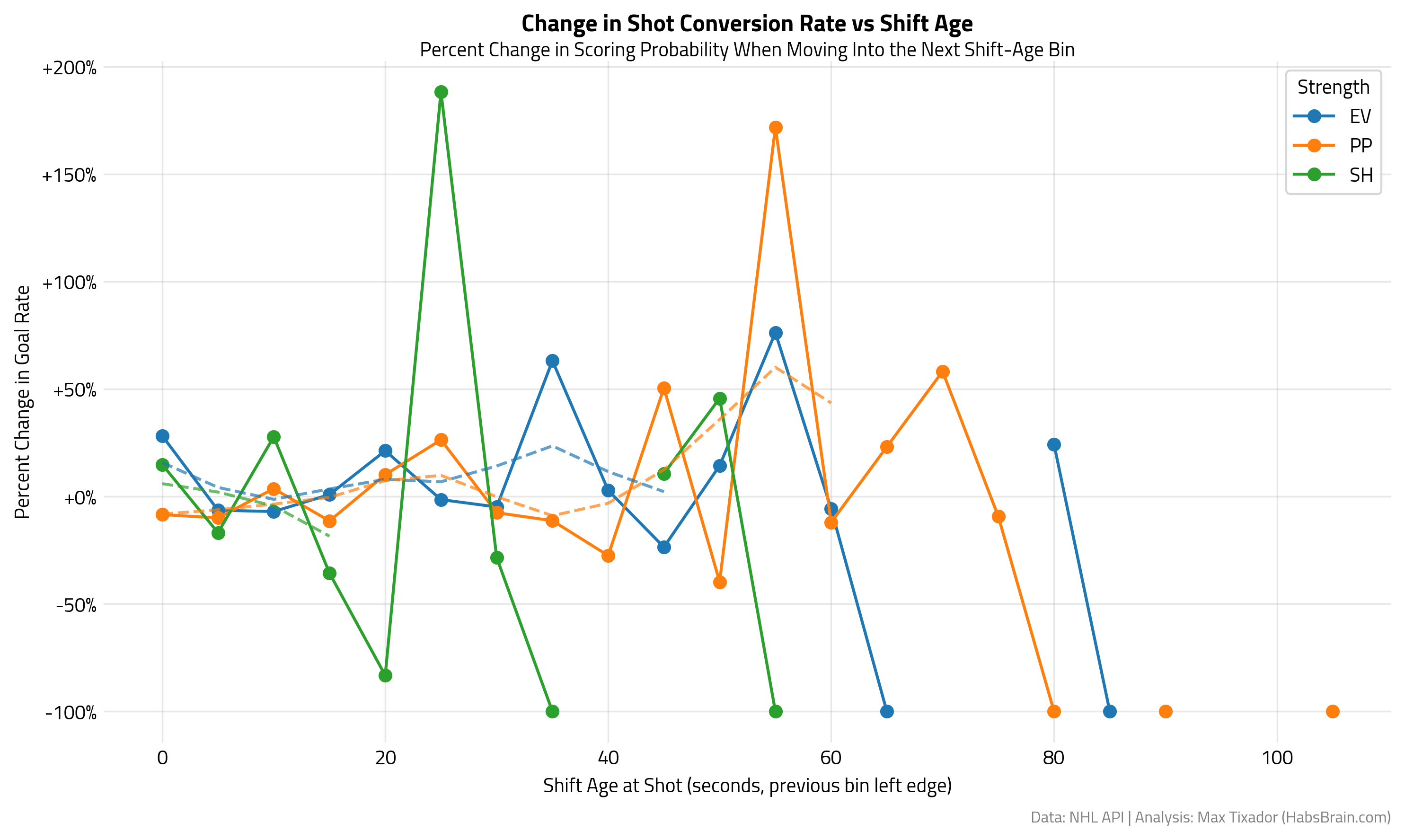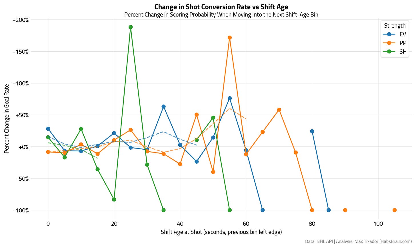 Looking at the % change of shot conversion from the previous bin, we can build more confidence that shots conversion is higher at the end of longer shifts. There is maybe a new variable to include in your expected goals model!