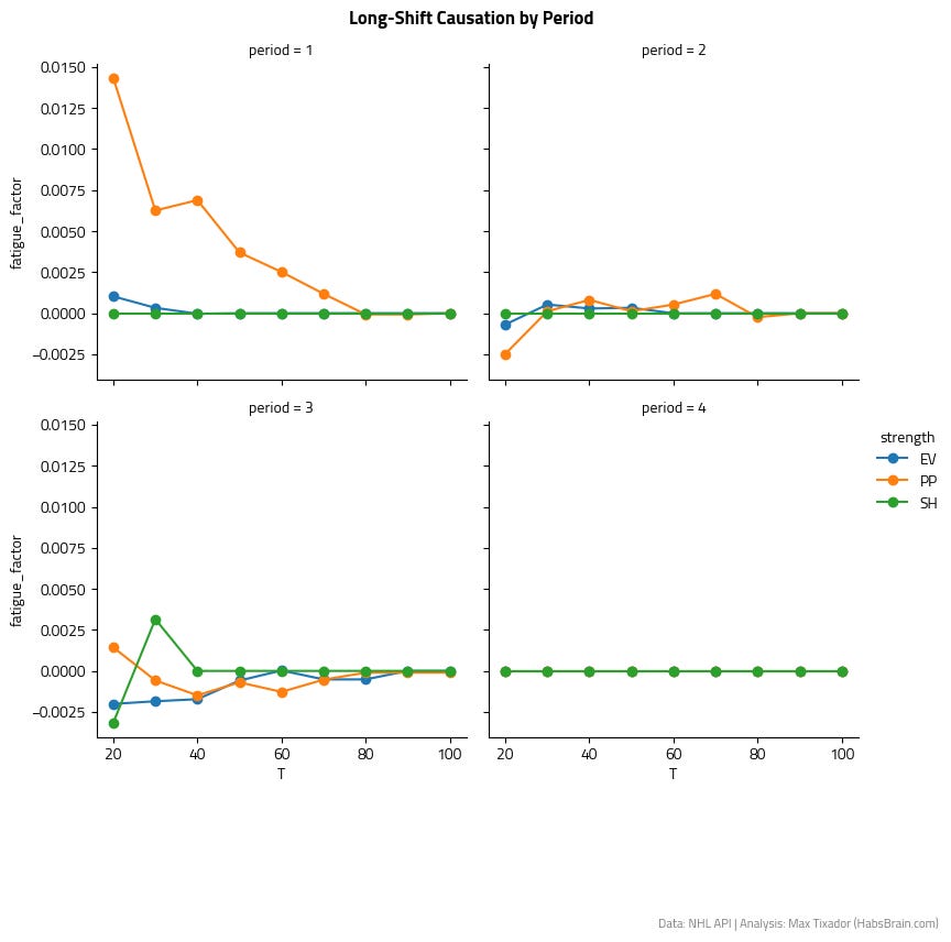Very interesting! This lines up with what I looked at using average skating speed and distance travelled for full games compared to corsi and xG rates. NHL players are very good at conserving their energy throughout a game and are able to absorb longer shifts most of the time.