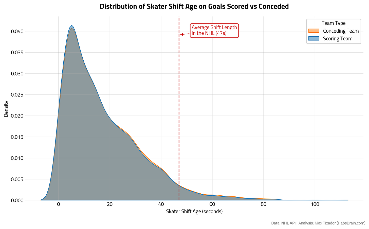 In this figure, we can understand that goals are scored when players are still fresh. It makes sense considering that goals are generally scored by quick plays, quick transitions, and don’t require complex buildups. What’s more interesting is to see that the distributions covered by the Scoring and Conceding team are overlapping, suggesting that goals scored because of a Shift Age advantage are rare. In other words, this reflects that coaches do a good job at preventing getting scored on because the other opposing team got fresh players against an already tired group. So, even if fatigue (accrued player shift age) does occur, it does not explain a lot of goals against.
