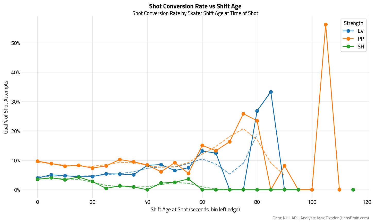 When we have Shot Attempts and Goals, and we divide one by the other, we get a really fun metric: Shot Conversion. The research is finally becoming fun! Shot conversion at EV and PP is quite stable until it reaches the 60s bin, where we see a significant rise. It is important to note that 60s is longer than the average NHL shift, so seeing a notable change in shot conversion at this key point raises questions. I wonder if this could be due to a goalie losing focus or defensive breakdowns after sustained pressure (both ideas would require additional research and are not in the scope of this blog), or a pattern where the offensive team is getting better looks late in shifts. Short-handed results, once again, don’t tell much.