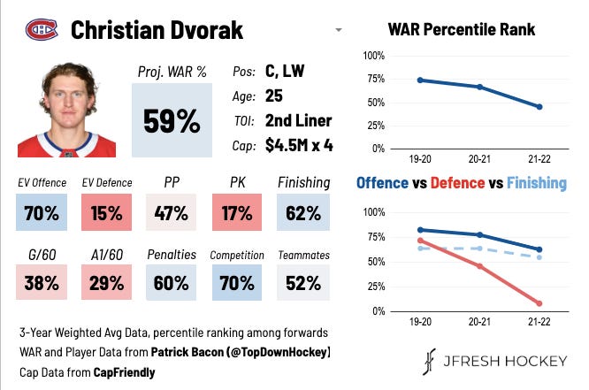 I won’t go in depth (like I should), but in a couple of lines, here’s what I have for you. Dvorak was supposed to be a good 2nd line C when he arrived in MTL. After a really nice preseason game that gave the big hopes for the season, he has disappointed. The Maple Leafs are really good at making average Habs players look like superstars smh..