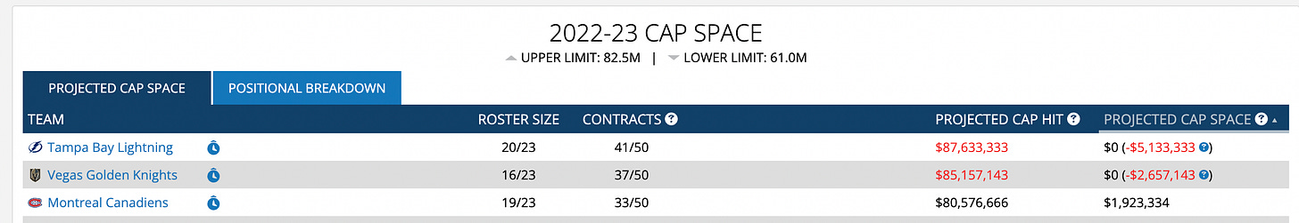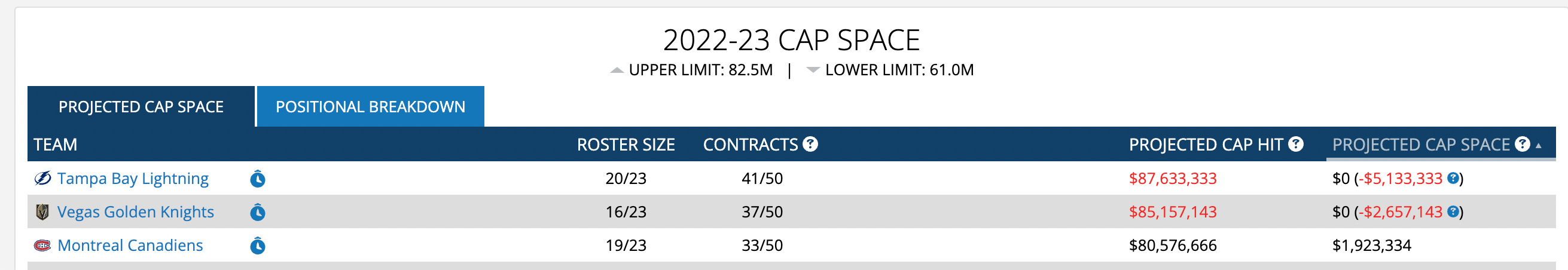 If you follow the Canadiens really closely, you might be aware that the Canadiens are dealing with with a lot of problems right now. They need new personnel because a lot of the people who were hired under the Bergevin-era are leaving, some really important player is potentially having a career-threatening injury, etc. Also, despite being one of the worst teams of the league, they are close to the salary cap upper limit. The biggest issue here? They only have 19 players under contract. They have Alexander Romanov to sign this summer (if they do not trade him), and Cole Caufield to sign next summer.
