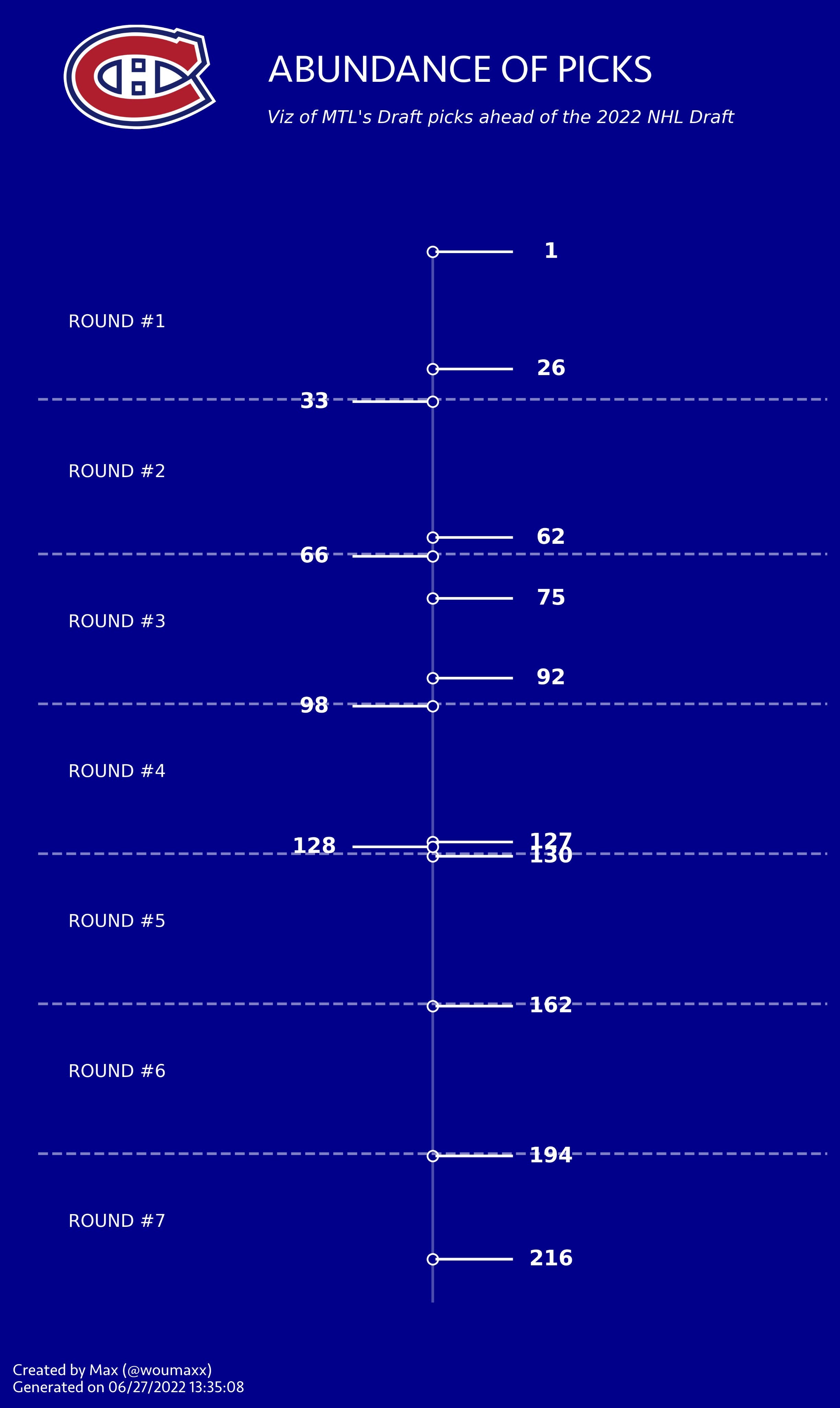 Before I finally stop with Draft content, here is a Viz showing MTL’s Draft picks. Remember that the Canadiens have a league-high 14 picks for the NHL Draft that will happen in their arena.