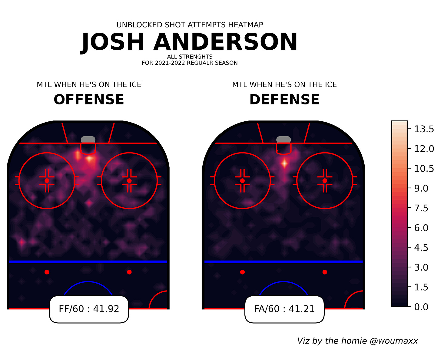 Josh Anderson’s game can be summarized in one sentence : he a big, scoring winger who is at his best when he’s out-skating defensemen and out-muscling defensemen on the rush to generate a potential shot attempt. He is a fast big player, so he is good at putting pressure on the opposing players when they have the puck. He is forcing them to play fast because he will hit them with a lot of force. Other than that, he is apparently a good leader, but it’s not in the things I can verify. He also has flaws. When he does not carry the puck to create a scoring chance for himself, he is usually difficult to notice. He has bad playmaking abilities, he struggles to make himself valuable on power-play (because PP is rarely rushes) and he turns the puck over a lot. Also, I know that hockey analytics hate points a lot but, he does not produce like the top-6 winger he is expected to be. Knowing that the player is basically average offensively at evens, bad defensively, bad on PP, does not play on PK, but might have leadership… we can come up to the conclusion that he is not living up to the contract Marc Bergevin gave him as soon as he was acquired from the Blue Jackets.
