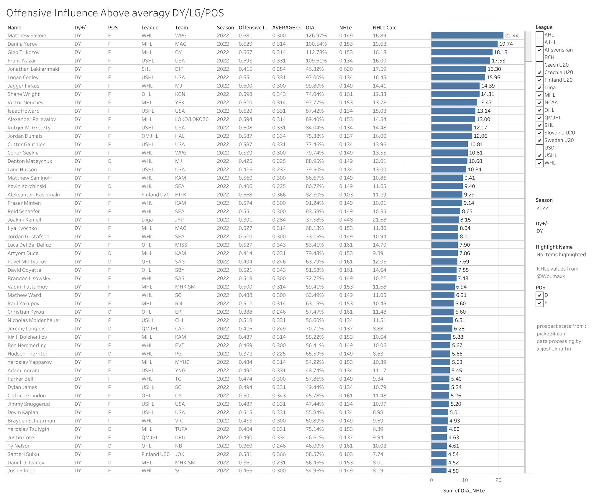 I was also glad to share my NHLe model with the master Joshua Khalfin (@Josh_Khalfin) on his 2022 NHL Draft Supertool. Here’s a screenshot I took from one of the numerous pages of his project. It is big, and it gives us a lot of insights on the prospects you want to know about ahead of the Draft that happens to be next week.